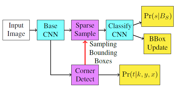 其中CNN被标记位蓝色,新组件为紫色,输出为黄色。采样边界框依赖性(用红色标注)在反向传播期间保持恒定,从而产生一个端到端的训练模型。角点分布与最终的分类分布采用交叉熵损失来联合优化。