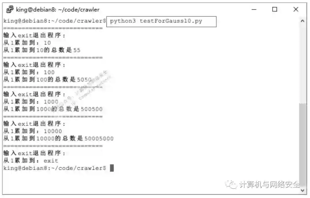 按Esc键,进入命令模式后输入:wq,保存testForGauss10.py。testForGauss10.py将使用最笨的方法求从1加到100的和,使用for循环一个数一个数地叠加。执行命令: