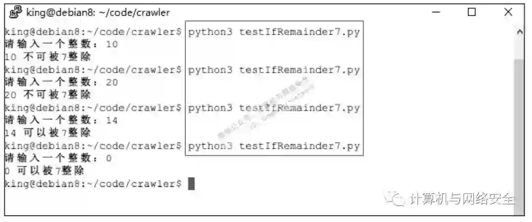 按Esc键,进入命令模式后输入:wq保存testIfRemainder7.py。testIfRemainder7.py要求用户输入一个整数,然后判断这个数能否被7整除,基本就是一个最简单的非此即彼的判断。执行命令: