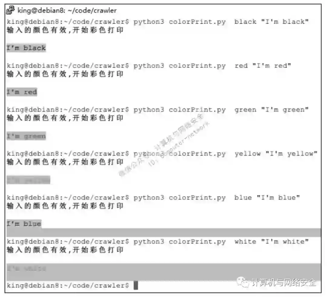 彩色打印已经实现了(白色打印时因为背景色也是白色,所以显示不明显),下面是将ColorPrint.py当作模块导入其他Python程序中使用。