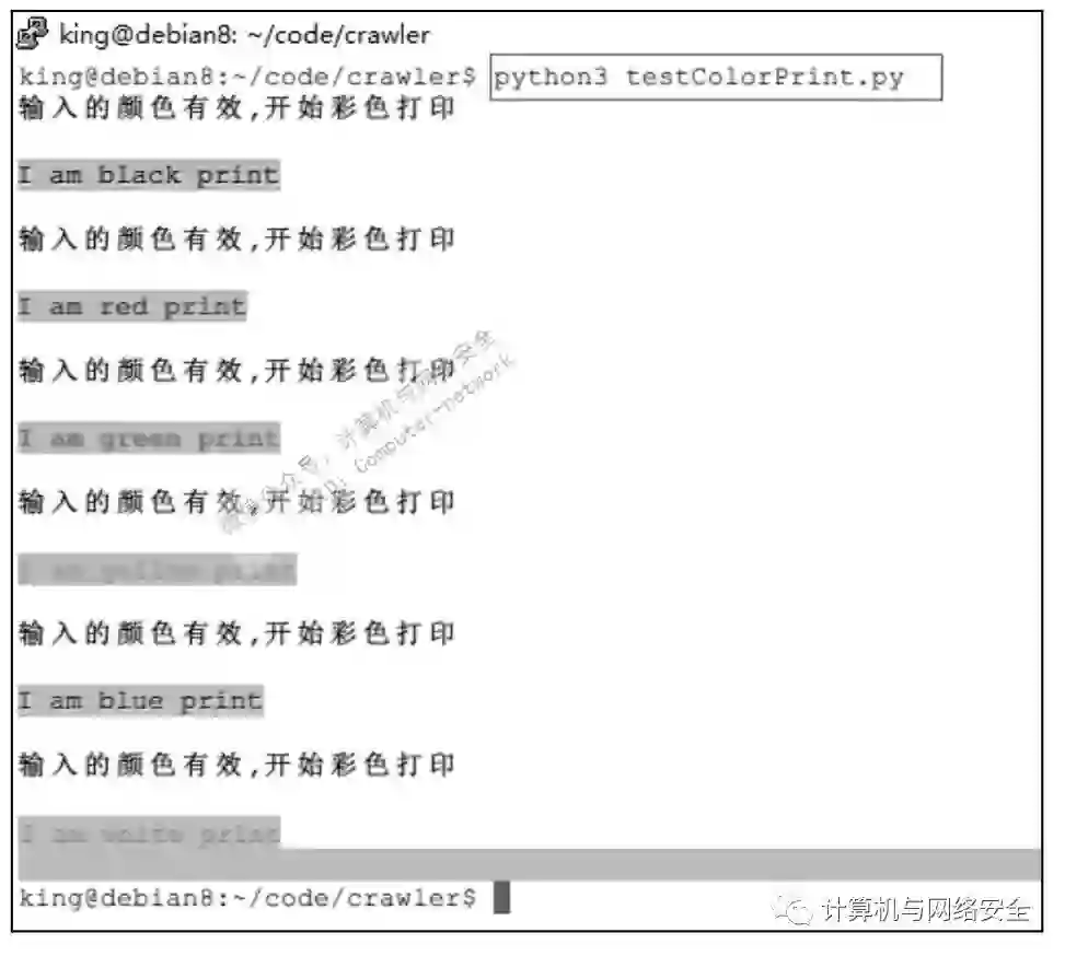 无须太复杂,写个最简单的testColorPrint.py,只要能将colorPrint.py当成模块导入使用即可。执行命令: