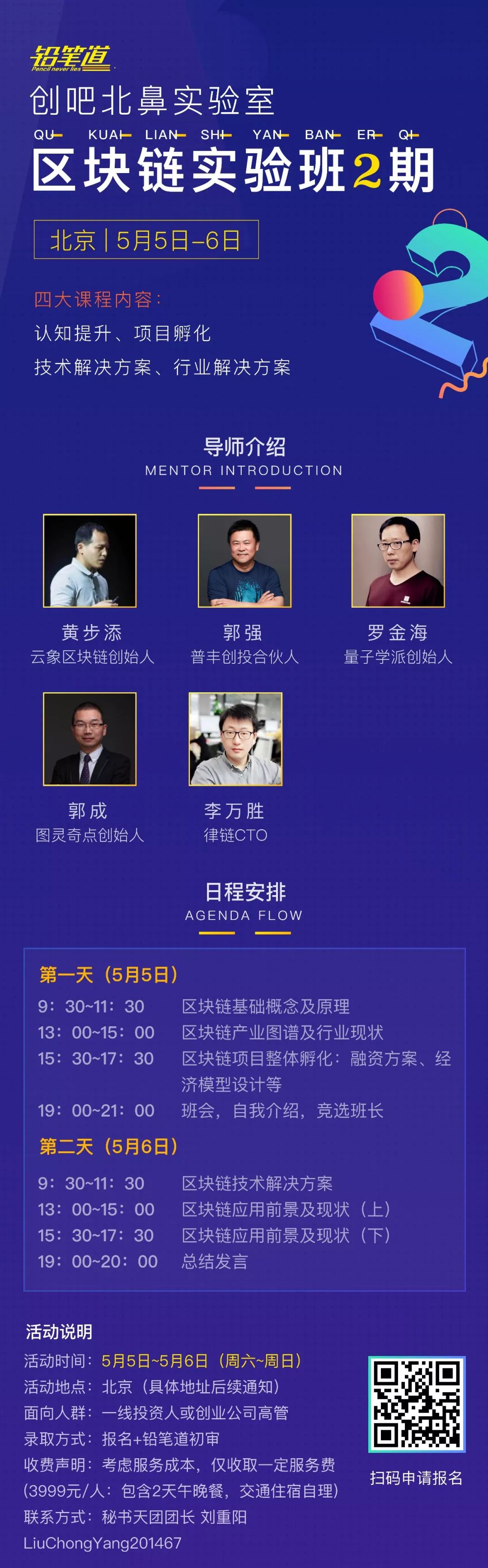 区块链实验班2期报名已经启动,即将满额。如果你是区块链行业的价值创业者或投资人,如果你想要了解更多关于区块链的内容,欢迎你加入区块链实验班2期。