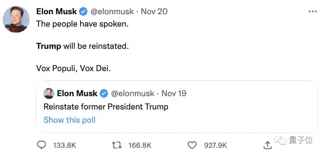 马斯克还特意指出,这是民意。因为他前一天在推特发起相关投票,结果参与投票的共有1500多万人次,其中51.8%的用户选择让特朗普回来。