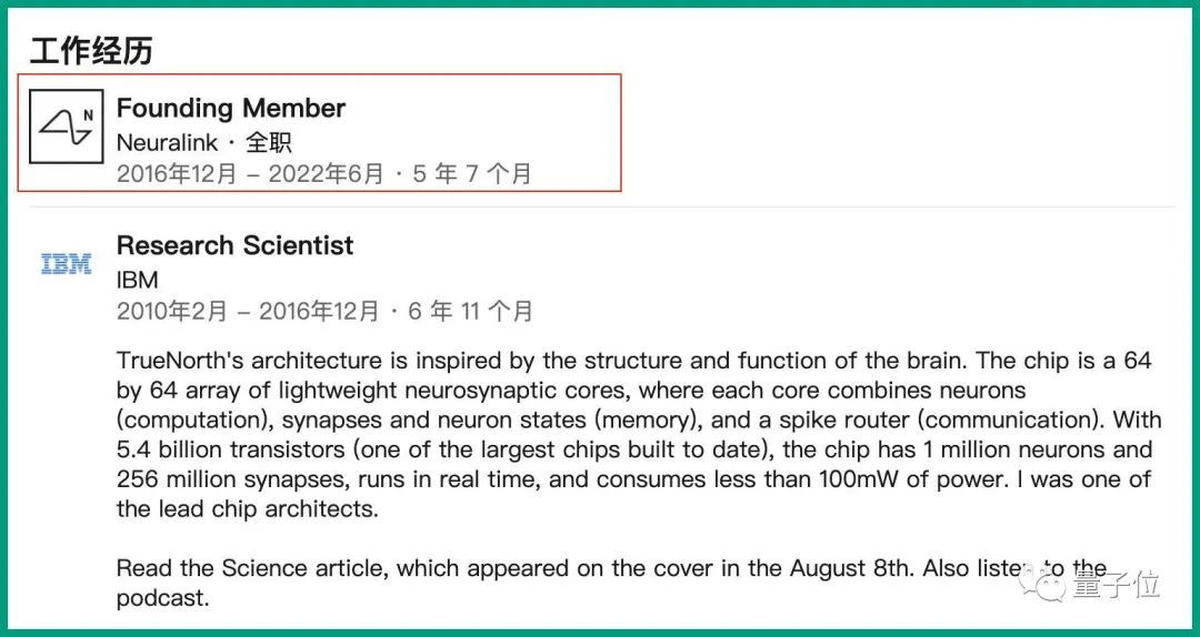 而最新被爆出来离职的联合创始人,叫保尔·梅罗拉 (Paul Merolla),强项是脑机最核心的关键——类脑芯片。