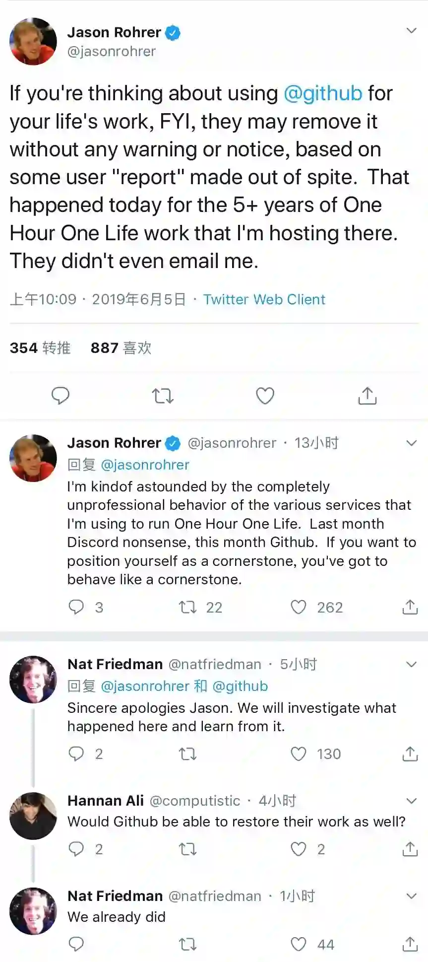 知名游戏设计师兼程序员 Jason Rohrer 昨天正好遭遇了上述的情况,为此他在推特“吐槽”了一番,并说道,在没有收到任何警告和通知的情况下,他使用了 5 年的 GitHub 帐号(包含 5000 个 commit 和 23 个仓库)被官方屏蔽了,其中最重要的一个 repo —— 托管在 GitHub 已超过 5 年并十分活跃的《One Hour One Life》开源游戏 repo 也未能幸免。