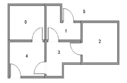现有一个5房间的房子,如图1所示,房间与房间之间通过门连接,编号0到4,5号是房子外边,即我们的终点。我们将agent随机放在任一房间内,每打开一个房门返回一个reward。图2为房间之间的抽象关系图,箭头表示agent可以从该房间转移到与之相连的房间,箭头上的数字代表reward值。