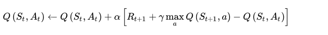 我们首先会初始化一个Q表,用于记录状态-动作对的值,每个episode中的每一步都会根据下列公式更新一次Q表