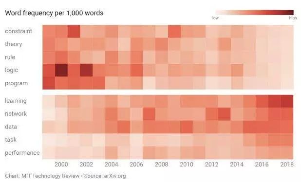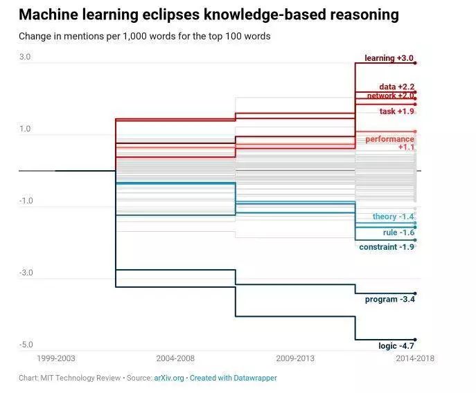 在作者统计出来的词汇出现概率中,与知识系统相关的词汇,如“逻辑”、“约束”、“规则”等词汇的跌幅最大。那些与机器学习相关的——如“数据”、“网络”和“性能”——增长最快。