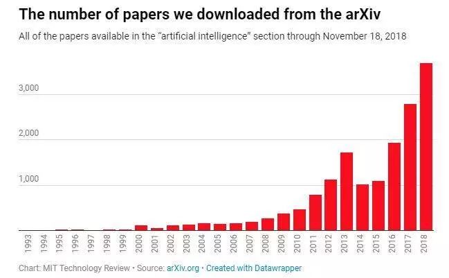 图 截至2018年11月18日,arXiv“人工智能”板块可获得的所有论文(来源:麻省理工科技评论)