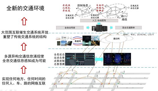 在这个基础上还会发现一个很重要的问题,就是全面信息扑面而来以后,我们发现系统结构也会发生变化。即有了这样一个结构以后,我们发现交通系统里面就没有边界了。我们知道我们控制的系统目标应该是固定的。但是这样的交通系统是无边的,只要有人的地方就都有道路都有车辆,因此我们需要划一个界限研究一个交通,如果要用传统控制的方法去研究就会面临新的挑战,传统的交通理论就面临一个新的变化,原先我们是用流体力学的方式研究传统交通流量,但是现在需要换一种思路。