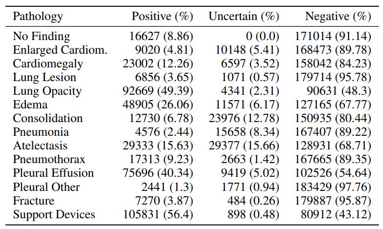 表 1:CheXpert 数据集包含 14 个标记的观察结果。作者报告了训练集中包含这些观察结果的研究数量。