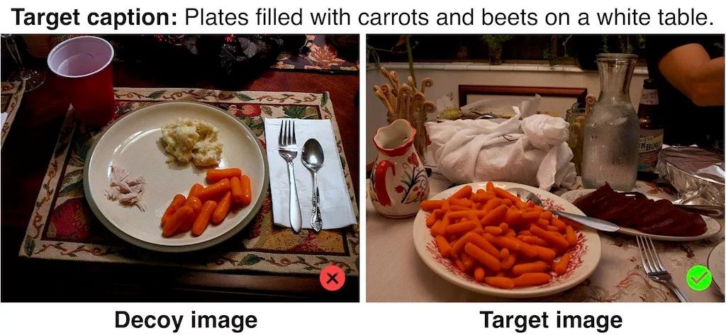 图 2:COCO-BISON 数据集收集过程图示:研究者使用 COCO captions 数据集进行 BISON 数据集收集工作。首先利用描述相似度寻找相似图像,然后标注者选择对图像对中其中一个图像的描述,最后研究者让多个标注者分别基于描述选择正确的图像,从而验证标注的准确性。