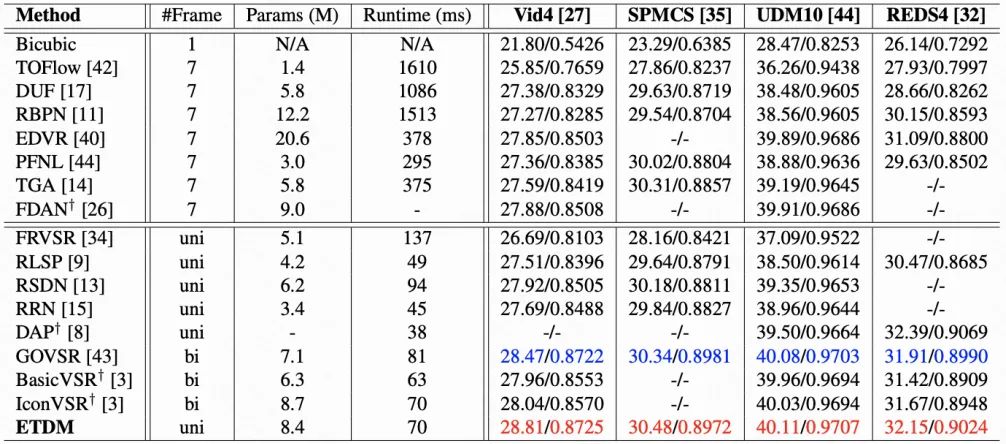 本文是快手与大连理工大学贾旭副教授合作的,包括TGA,RSDN,RRN系列视频超分辨率工作的后续工作。所提出的ETDM在多个公开数据集上取得了不错的结果,以单向循环卷积的结构超过了SOTA的EDVR,GOVSR,BasicVSR等方法。