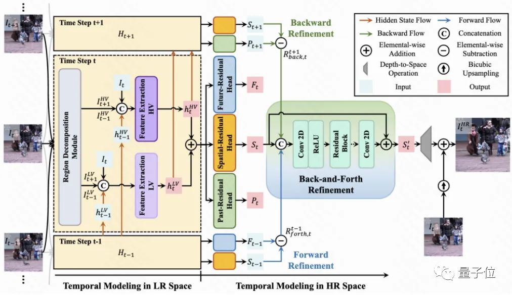 残差图的另一层含义是参考帧到邻近帧的转换“桥梁”。于是,除了重建当前时刻的超分辨率结果外,我们还会重建当前时刻到过去和未来的高分辨率时序残差图。