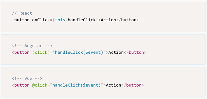 这三个框架都可以在组件中指定事件处理器,从而实现对 DOM 事件的监听,并在它们被触发时执行某些 JavaScript 代码。