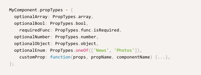 子组件必须明确声明它希望接收的 props 或 inputs,我们也可以给这些数据指定类型。在 React 中可以使用 PropsType 函数库(https://www.npmjs.com/package/prop-types)来指定类型,例如: