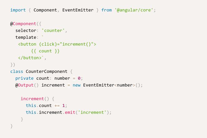 在 Angular 中自定义事件可以通过使用 @Output 修饰符给 EventEmitter 实例添加注解来实现,并通过调用 event emitter 的 emit 方法来触发这个自定义事件: