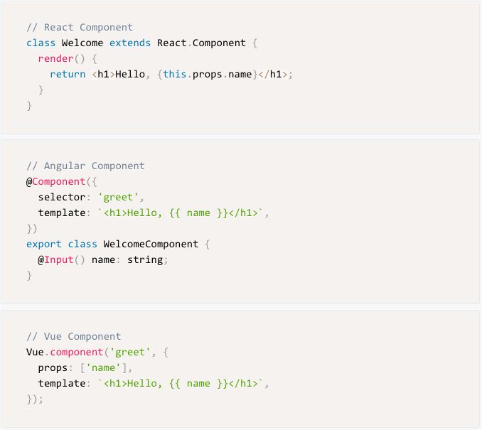 当然三个框架的代码也存在差异,例如,在 React 中我们可以用函数来实现组件。Angular 和 Vue 可以引用定义在 HTML 文件中的模板。Vue 还可以在一个独立的 `.vue` 文件中编写集 HTML,CSS 和 JS 于一体的组件。然而,组件的核心思想在所有三个框架中都是相同的。