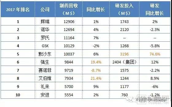 根据外药企2017年财报的营收数据显示,排名前十的药企分别是辉瑞、诺华、罗氏、葛兰素史克(GSK)、默沙东、强生、赛诺菲、艾伯维、礼来、安进。