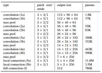 文中使用的是一个类似于VGG net的卷积神经网络,每两个卷积层后面跟一个最大池化层,最后是一个全连接层。它和VGGnet最大的不同之处在于将VGG net中的最后两层卷积层换成了局部连接层(本篇论文是用于人脸识别的,因此加入局部连接层来利用人脸的结构化特点)。网络的结构如下: