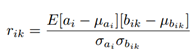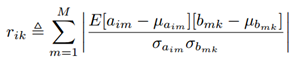 记aim为当前层中第i个feature map中的第m个神经元(m=1,2,…,M.其中M表示卷积后得到的feature map的大小), 上一层中和它相连接的所有神经元记为bmk(k=1,2,…,K.其中K是滤波器的大小)。则aim和bmk的相关性系数为:
