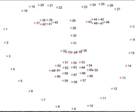这就是我们需要拿到的东西,今天我们要做的就是通过Dlib 检测出68个 人脸关键点,然后将这68个关键点绘制到视频流中