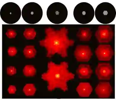 随后的研究发现,在共振腔内某个特殊平面上,光的衍射行为变得非常简单,光的密度分布呈现出衍射受限的自相似分形结构。通过改变共振腔中的一些参数设置,可以改变激光在该平面上的密度分布,从而产生希尔宾斯基镂垫(Sierpinski gasket)、科赫雪花(Koch snowflake)等经典分形图案。