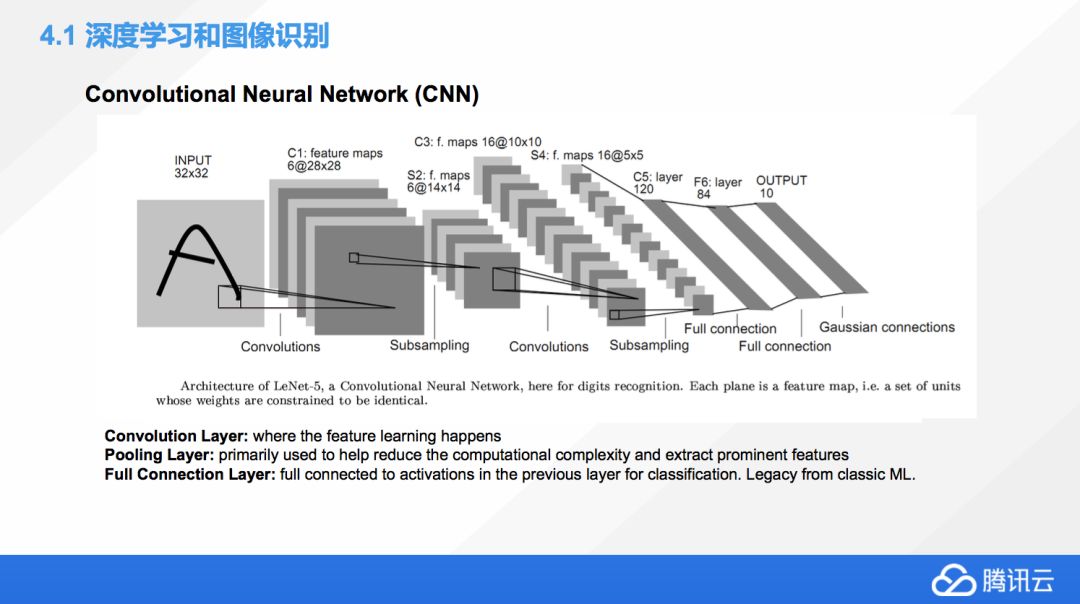 最后会有一个叫全连接层,它是个历史遗留物,现在大家其实慢慢的也在减少使用全连接层,全连接层一般情况下,它的作用就是对前面的各种池化卷积最后的结果进行一个归类。而实际上现在深度学习比较讲究端对端学习,又讲究效率比较高,这种情况下面,有的时候全连接层的意义就不是那么大,因为这个分类有可能在卷积的时候就把它做了,其实这个里面还是有很多的可以提升的地方。