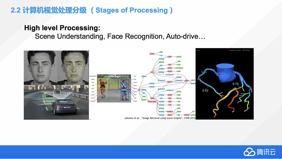 举一个简单例子,比如 Low Level 上面我们可以做图像的降噪、优化、压缩、包括边缘检测,不管是哪一条,我们都是可以想象一下,我们是离这个图片非常近的去看这个细节。High level 是什么?包括情景理解、人脸识别、自动驾驶,它基本上是从一个比较远的角度来看这个大局。