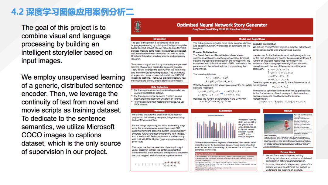 这个项目除了最先我们对图像里面的对象识别过程使用的是监督学习,其他的都是非监督学习。这个系统是可以自然的去套用到很多不同的地方,只要换个不同的文章数据库,它就可以讲不同的故事。一些例子就是根据不同的图片,比如左上角这张是我觉得分数最高的:有一个女性在沙滩上面走路,经过我们的模型就输出了一个非常浪漫的故事,基本上符合这个情景。