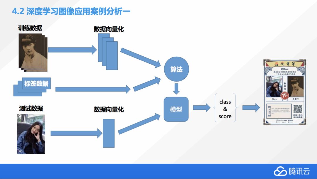 我们再聊一聊深度学习图像应用的案例,比如说我们提到的这个五四青年节活动,它是怎么样去设计的。首先呢,我们会有一些图片的训练数据,然后在进入模型之前,我们会对数据进行向量化,通过数据向量化,我们就可以得到一个模型,然后得到一个分类,和一个 score,这边的 score 只是模型对这种结果一个相对的分析,一般我们会选择 score 最高的一个分类,然后前端会从这个分类中间选择图片,生成H5的这个结果,大家就可以看到跟哪位历史上的有名的青年相似了。