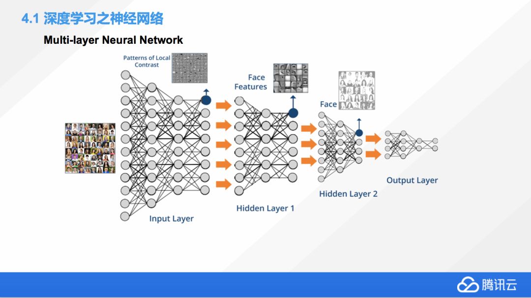 这个是对多重人脸识别设计的一个深度神经网络,我们可以看到输入层中间会做一些预处理,包括把图片转换成一些对比度图。第一个隐层是 Face Features,从人脸上提取关键的特征值。第二个隐层就是开始做特征值匹配,最后的输出层就是对结果进行输出,一般就是分类。