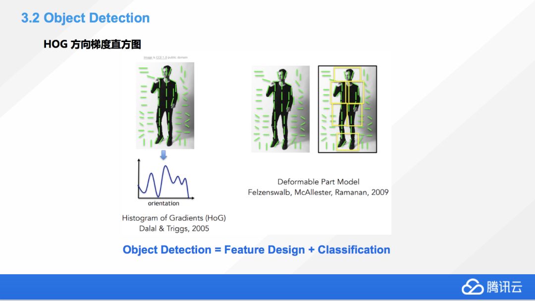 另外一个比较流行的方法叫 HOG 方向梯度直方图,比如像这张图片上显示,在图像中间,局部目标的表象和形状能够对灰度的梯度、还有边缘方向的密度有很好的表示。比如像这张图像,人身上的梯度就是向着上下方向。而对于背景,由于背景光的原因,如果我们做灰度的分析,会发现它的梯度是偏水平方向的,利用这种方式我们就很容易的可以把背景跟前景进行分割。另外如果很多小框里的梯度方向几乎一致的话,我们就可以认为它是一个对象,这个方法是很好的可以塑造一个分割的效果。实际上很早期的目标检测就是 Feature Design,所以说检测是基于分类的,也是这个意思。现在深度学习引入以后,很多理论也发生了一些变化,待会详细介绍一下。