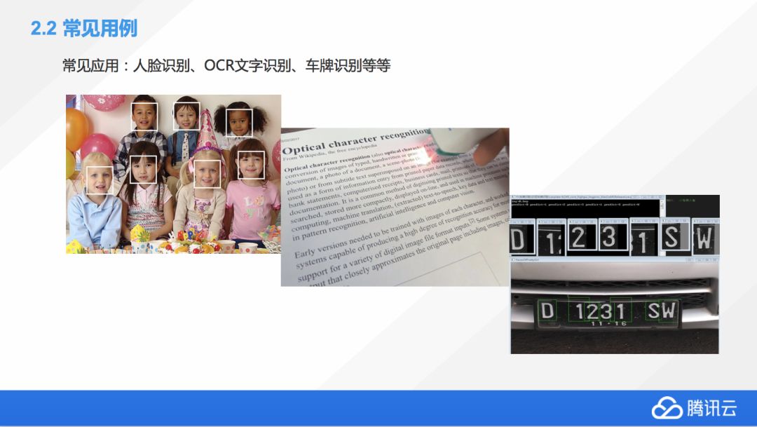 右下角是车牌检测,开车的时候不小心压到线了,闯红灯了,收到一张罚单,这个怎么做到呢?也是计算机视觉的功劳,它们可以很容易的就去识别这个照片里的车牌,甚至车牌有一定的污损,经过计算机视觉的增强都是可以把它给可以优化回来的,所以这个技术也是比较实用的。