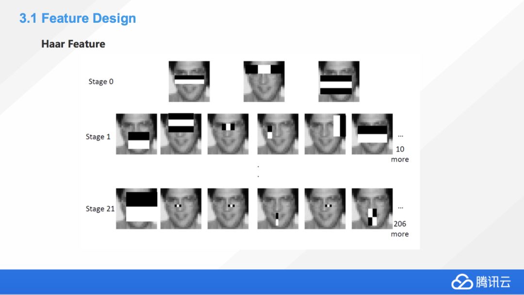 这个叫 Haar Feature,相当于结合了前面边缘特征,还有一些其他的一些特征的信息。Haar Feature 一般分为三类