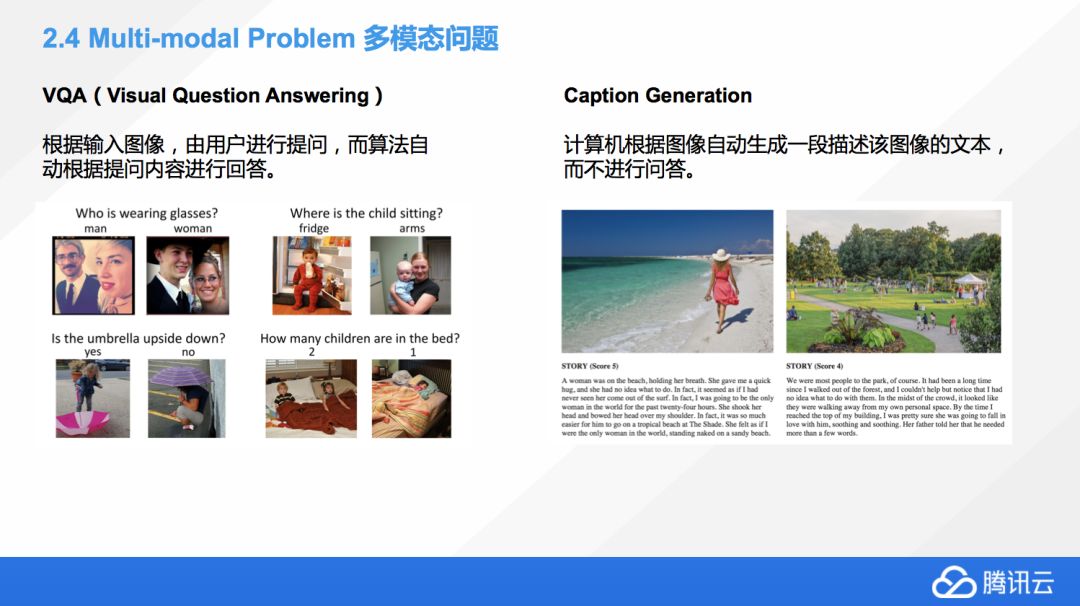 后面还有一些比较有挑战性的计算机视觉任务,我们归类把它们叫做多模态问题,其中包括 VQA,这是什么意思?这个就是说给定一张图片,我们可以任意的去问它一些问题,一般是比较直接的一些问题,Who、Where、How,类似这些问题,或者这个多模态的模型,要能够根据图片的真实信息去回答我们的问题。