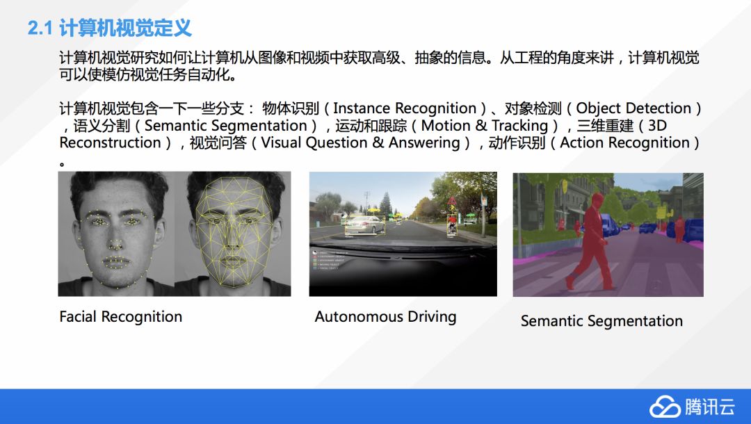 这边额外提一下语义分割,为什么要提这个呢?因为语义分割这个词也会在包括 NLP、语音等领域里出现,但是实际上在图像里面分割的意思跟在语音和 NLP 里面都很不一样,它其实是对图像中间的不同的元素进行像素级别的分割。比如最右下角这张图片,我们可以看到行人、车辆、路,还有后面的树,他们都用不同的颜色标注,其实每一种颜色就代表了一种语义。左边和中间的两幅图,可能我不用介绍,大家也应该能猜到了,一个是人脸识别,一个是无人驾驶,都是现在使用非常广泛和热门的应用。