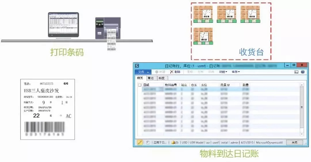 叉车根据运输任务到达指定收货台,叉车上的条码扫描仪扫描货盘上的条码,触发运输任务为“已开始”