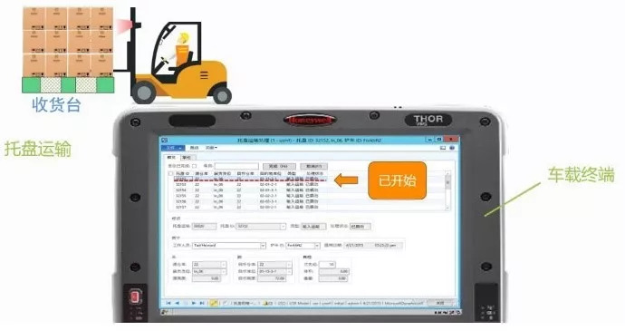 第四步:叉车司机根据车载终端提示进行搬运,完成后自动收集物流信息