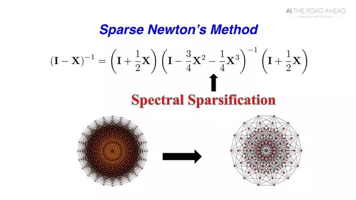 其中左右两个为线性的矩阵,中间为一个凸的线性组合。那个这个等式有什么用处呢?大家知道,牛顿算法是二阶收敛的,收敛非常迅速。中间的矩阵组合越来越接近I的,而且是以二阶的速度接近。那么为什么其他人不用牛顿算法算这些呢?因为用牛顿算法会让中间部分很快变得很稠密。数学家在用这个,实际没有人在用这个解问题。但我们在解电流过程中一直在做稀疏,当我看到这个问题时,我们能解决了,只需要把中间部分稀疏化就行。