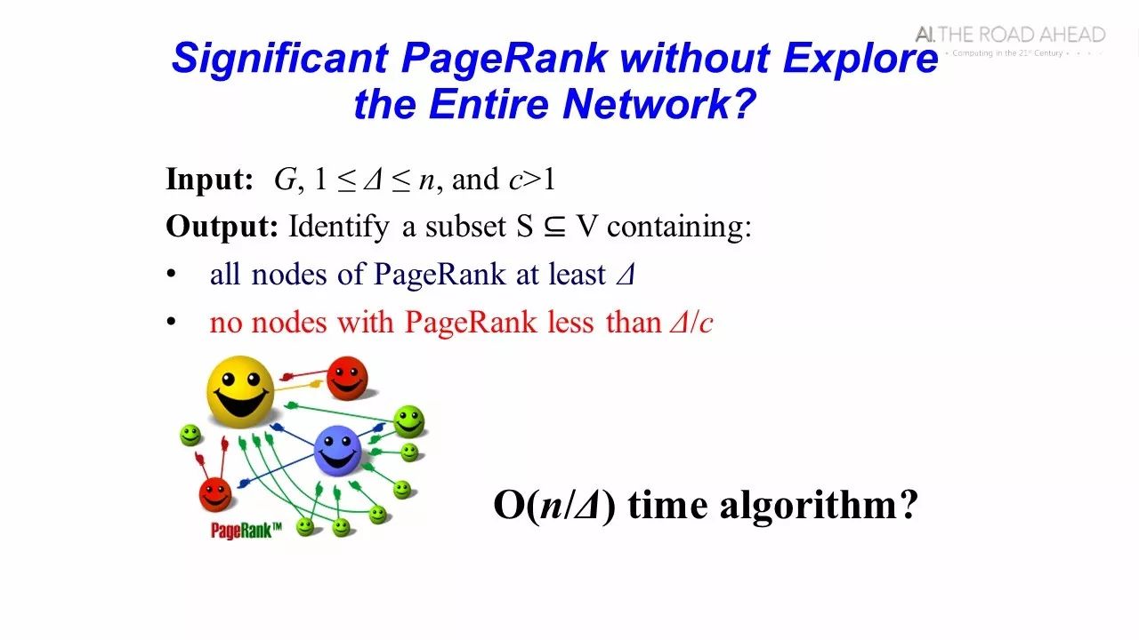 我们举个很简单的例子,就是Google在对网页的重要性排序,就叫PageRank。PageRank的实际意义就是,当用户停留在某一个网页上时,随机走到下一个相邻网页中,其中偶尔会回到全局中其他点,最后求用户停留在这些网页上的分布。在回答网页搜索查询时,Google会拿这个PageRank值作为指标,但Google在回答问题时并不需要计算所有的网页PageRank值,它只需要关注显著的PageRank。比如它有一个阈值Δ,把所有PageRank值大于Δ的网页输出,反之去掉。这件事情最简单的算法是,通过局部探索对网页PageRank值做计算,经过几轮之后就能得到最终的值。问题是能否在O(n/Δ)的时间内把它算出来。这个量太大了,有平方级别的规模,但计算时不需要都算出来,可以通过局部近似得到。局部近似可以用常数时间把一行的PageRank值近似出来。最后需要解的问题是一个很简单的问题。具体是,给定一个向量,它的每个元素都是0和1之间的,然后求这一行的和是否大于Δ或者小于Δ的一半。当你能把这个简单问题做出来之后,你就能求出显著的PageRank值。