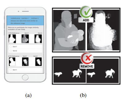 人作为高级灵长类动物,擅长捕捉对象的结构,因此前景图检测的评价指标的排序结果,应该和人的主观排序具有高度一致性。我们通过收集45个不同年龄,学历,性别,专业背景的受试者的排序结果进一步证明了提出的评价指标与人的评价具有高度的一致性(最高可达77%)。下图10所示为用户调研的手机平台。