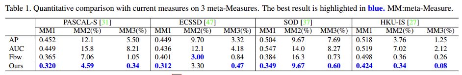 为了公平的比较,指标首先在公开的一个前景图检测数据集ASD[3]上对4个元度量进行评测。评测结果显示我们的结果取得了最佳性能: