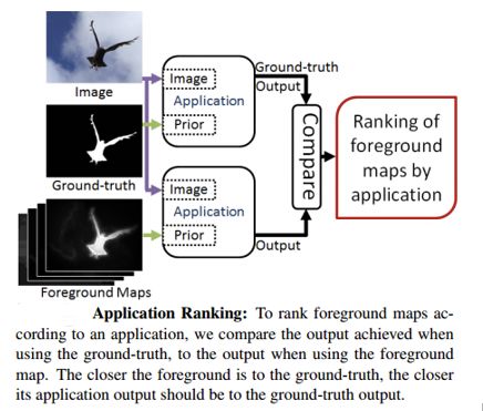 推动模型发展的一个重要原因就是应用需求,因此一个指标的排序结果应该和应用的排序结果具有高度的一致性。即,将一系列前景图输入到应用程序中,由应用程序得到其标准前景图的排序结果,一个优秀的评价指标得到的评价结果应该与其应用程序标准前景图的排序结果具有高度一致性。如下图6所示。
