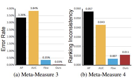 为了证明指标的有效性和可靠性,研究人员采用元度量的方法来进行实验。通过提出一系列合理的假设,然后验证指标符合这些假设的程度就可以得到指标的性能。简而言之,元度量就是一种评测指标的指标。实验采用了5个元度量: