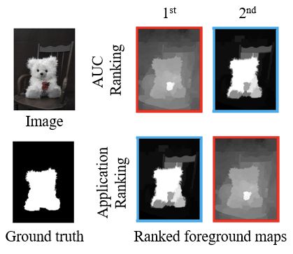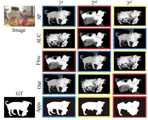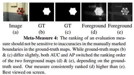 前景图的度量对于物体分割算法的发展有着重要的作用,特别是在物体检测领域,其目的是在场景中精确地检测和分割出物体。但是,当前广泛应用的评估指标 (AP, AUC) 都是基于像素级别的误差度量,缺少结构相似性度量,从而导致评估不准确(优秀算法排名比拙劣算法靠后)进而影响了领域的发展。