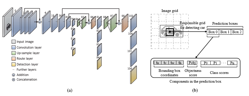 如上图(b)所示,为利用YOLOv3进行目标检测时的网络输出。