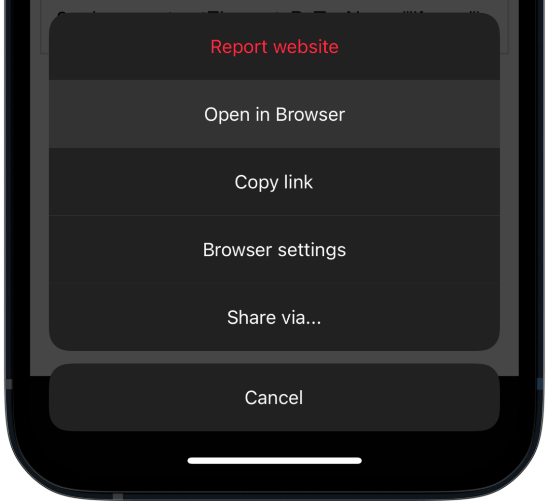 大多数 app 内置浏览器都有办法将网站跳转至 Safari 打开。一旦你在 app 中打开了某个网站,只需点击如图所示的「在浏览器中打开」 。如果这一按键并不存在,你就需要去将网页 URL 复制粘贴到你的浏览器中去打开了。
