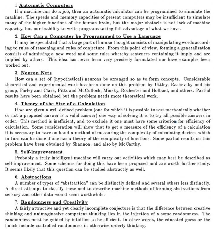 不过反过来说,六十多年前的 workshop 提出的研究课题直到现在都有还未解决的、还在热烈讨论研究的,不禁让人嘴角上扬。这当然说明了几位先驱的高瞻远瞩,但这是否也说明在如今满天飞的论文中,真正有开创新的、触及本质的研究还是太少呢?我们也许给一些问题给出了更好的答案,但许多方面我们还未能提出更好的问题。
