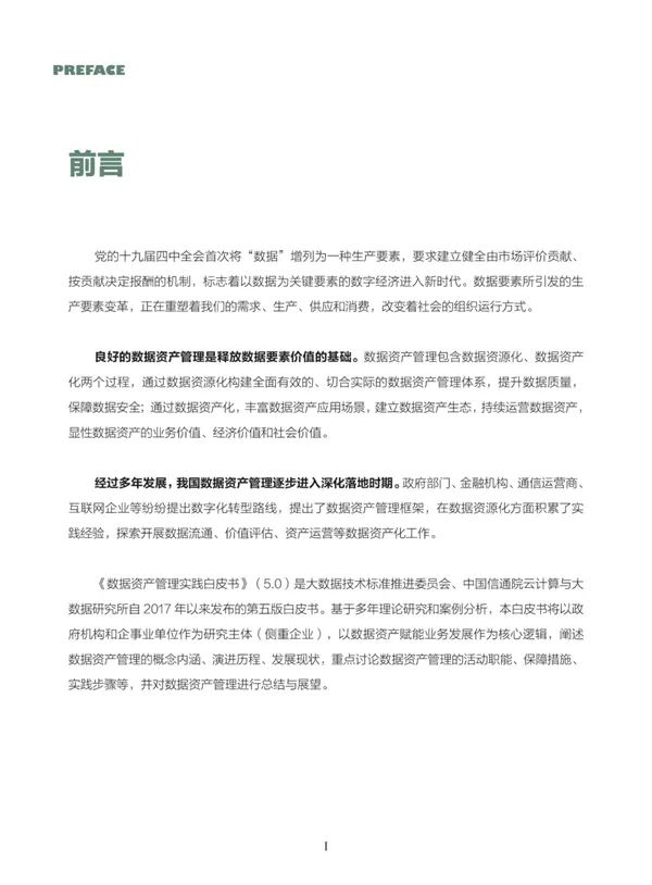 《数据资产管理实践白皮书(5.0版)》结合业界数据资产管理先进理念和关注焦点,总结最新实践案例,在《数据资产管理实践白皮书(4.0版)》基础上,聚焦数据资产前沿问题、优化数据资产管理理念,进一步完善数据资产管理框架、明确数据资产管理路径。